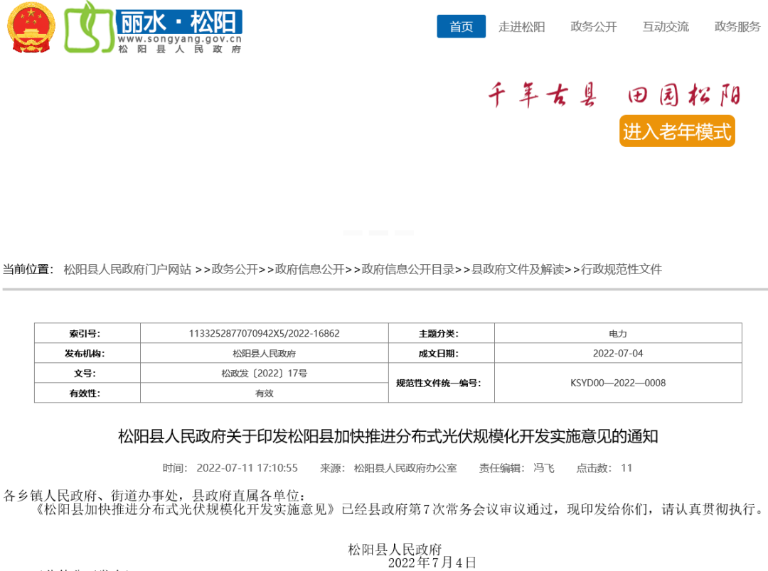 7月11日,松陽政府網(wǎng)發(fā)布“《松陽縣加快推進(jìn)分布式光伏規(guī)?;_發(fā)實(shí)施意見》”。