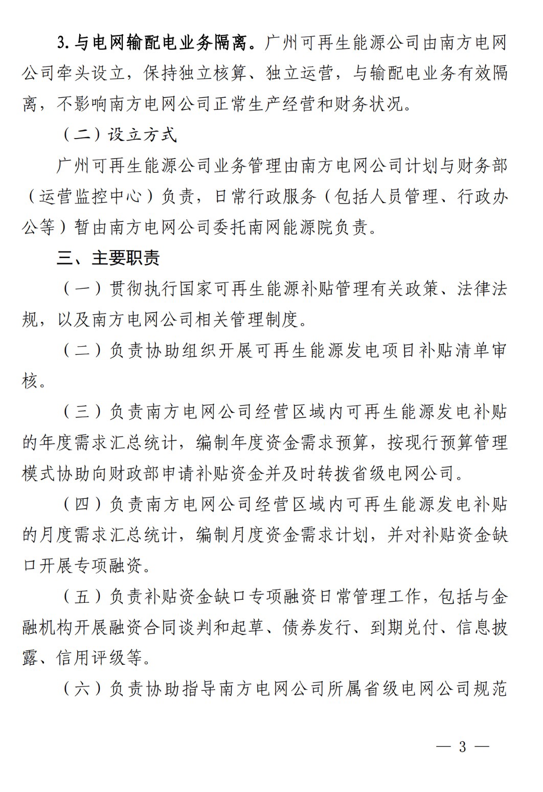 文件明確,廣州可再生能源公司主要職責(zé)包括負(fù)責(zé)南方電網(wǎng)公司經(jīng)營(yíng)區(qū)域內(nèi)可再生能源發(fā)電補(bǔ)貼的月度需求匯總統(tǒng)計(jì),編制月度資金需求計(jì)劃,并對(duì)補(bǔ)貼資金缺口開(kāi)展專(zhuān)項(xiàng)融資。負(fù)責(zé)補(bǔ)貼資金缺口專(zhuān)項(xiàng)融資日常管理工作,包括與金融機(jī)構(gòu)開(kāi)展融資合同談判和起草、債券發(fā)行、到期兌付、信息披露、信用評(píng)級(jí)等。以及開(kāi)展可再生能源發(fā)電項(xiàng)目補(bǔ)貼清單審核、年度需求匯總統(tǒng)計(jì)、編制年度資金需求預(yù)算,協(xié)助向財(cái)政部申請(qǐng)補(bǔ)貼資金、落實(shí)補(bǔ)貼的監(jiān)督核查等等。