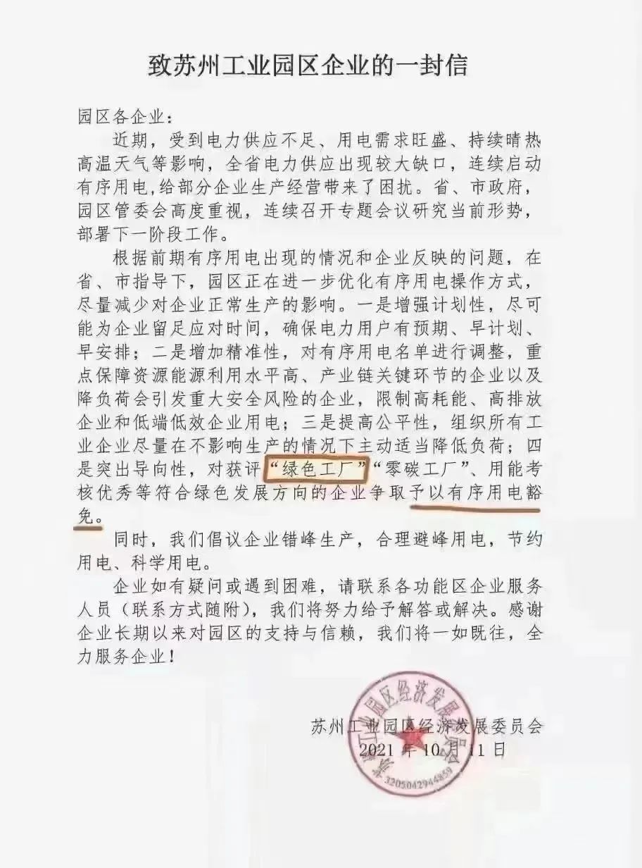 去年10月11日,蘇州工業(yè)園的企業(yè)收到一通知,對(duì)獲評(píng)綠色工廠(chǎng)、零碳工廠(chǎng)的企業(yè)予以有序用電豁免。企業(yè)光伏電站,不限電!體現(xiàn)了園區(qū)對(duì)“綠色發(fā)展”理念的高度重視 。