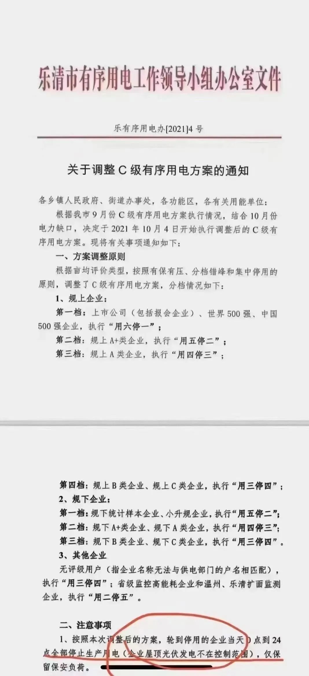 早在去年10月初,樂(lè)清市有序用電工作領(lǐng)導(dǎo)小組的文件《關(guān)于調(diào)整C級(jí)有序用電方案的通知》里,就已經(jīng)標(biāo)注企業(yè)屋頂光伏發(fā)電不在(全部停止生產(chǎn)用電)控制范圍內(nèi)。