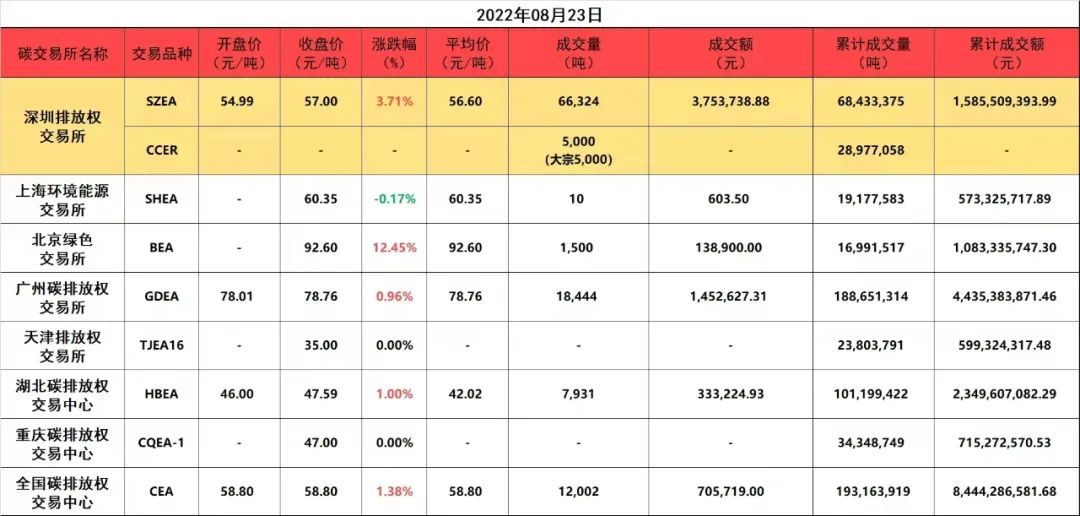 2022年8月23日,國(guó)內(nèi)七大排放權(quán)交易所,一標(biāo)噸二氧化碳的均價(jià)在42~92元;全國(guó)碳排放交易中心的日平均價(jià)格也高達(dá)58.8元/噸,日成交額為70.6萬(wàn)元,累計(jì)成交額高達(dá)84.4億元!