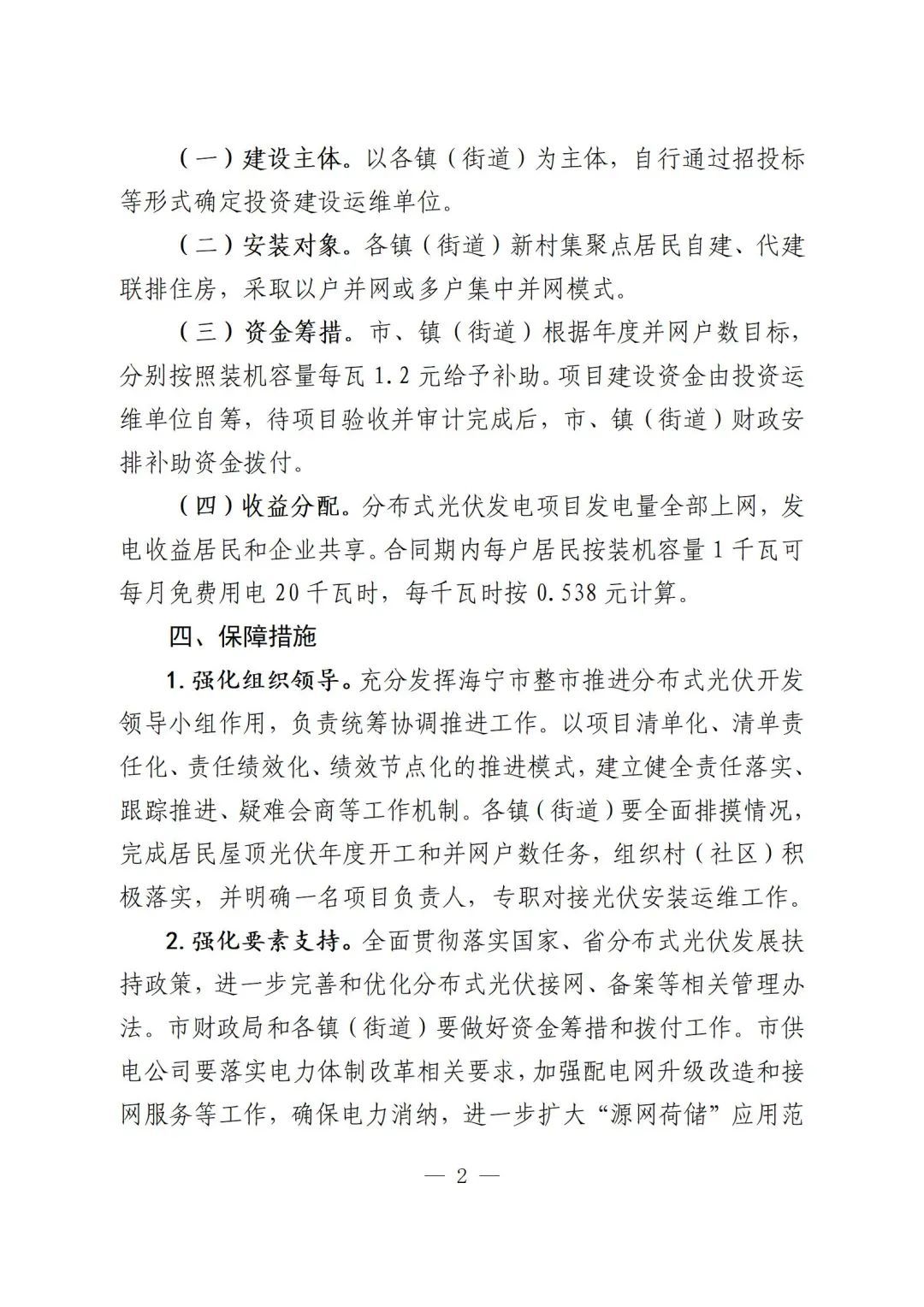 海寧市發(fā)展和改革局近日就《海寧市“萬戶光伏 綠色共富”行動(dòng)實(shí)施方案(試行)》(征求意見稿)公開征求意見,力爭到2025年,全市建成1萬戶居民住房屋頂光伏項(xiàng)目,努力打造共建共用共享綠色能源的“海寧樣板”。市、鎮(zhèn)(街道)根據(jù)年度并網(wǎng)戶數(shù)目標(biāo),分別按照裝機(jī)容量每瓦1.2元給予補(bǔ)助。項(xiàng)目建設(shè)資金由投資運(yùn)維單位自籌,待項(xiàng)目驗(yàn)收并審計(jì)完成后,市、鎮(zhèn)(街道)財(cái)政安排補(bǔ)助資金撥付。分布式光伏發(fā)電項(xiàng)目發(fā)電量全部上網(wǎng),發(fā)電收益居民和企業(yè)共享。合同期內(nèi)每戶居民按裝機(jī)容量1千瓦可每月免費(fèi)用電20千瓦時(shí),每千瓦時(shí)按0.538元計(jì)算。