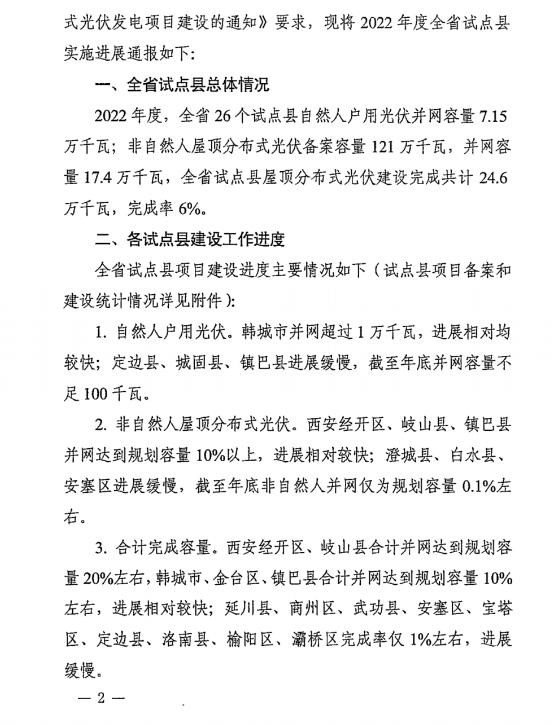 1. 自然人戶用光伏。韓城市并網(wǎng)超過1萬千瓦,進(jìn)展相對均 較快;定邊縣、城固縣、鎮(zhèn)巴縣進(jìn)展緩慢,截至年底并網(wǎng)容量不足100千瓦。