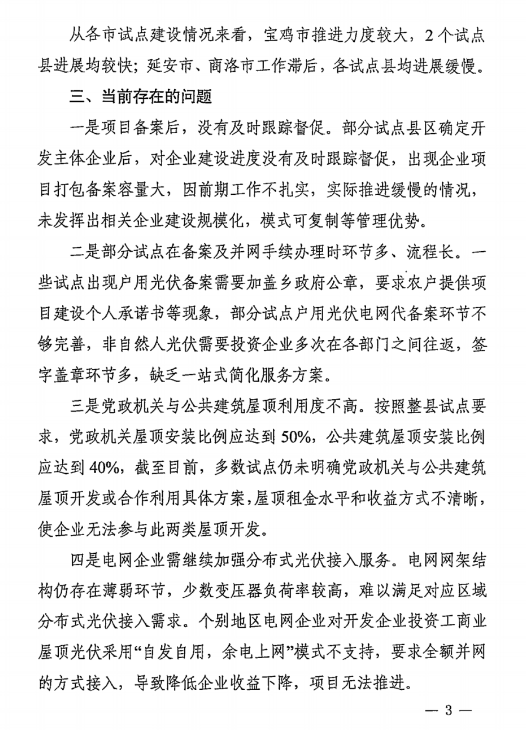 陜西發(fā)改委表示,當(dāng)前存在項(xiàng)目備案后,沒有及時(shí)跟蹤督促;部分試點(diǎn)在備案及并網(wǎng)手續(xù)辦理時(shí)環(huán)節(jié)多、流程長;黨政機(jī)關(guān)與公共建筑屋頂利用度不高;電網(wǎng)企業(yè)需繼續(xù)加強(qiáng)分布式光伏接入服務(wù)等問題。