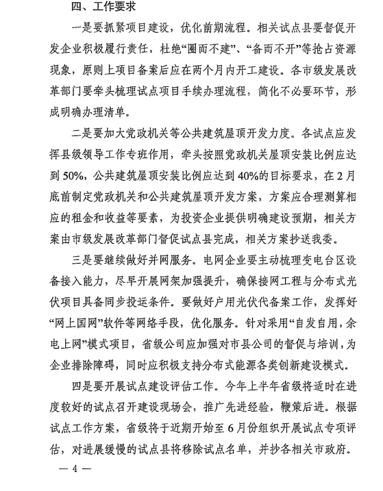 二、加大黨政機(jī)關(guān)等公共建筑屋頂開發(fā)力度。按照整縣試點(diǎn)要求,黨政機(jī)關(guān)屋頂光伏安裝比例應(yīng)達(dá)到50%,公共建筑屋頂光伏安裝比例應(yīng)達(dá)到40%,各縣區(qū)要在2月底前制定黨政機(jī)關(guān)和公共建筑屋頂開發(fā)方案,向我委報(bào)備留檔。