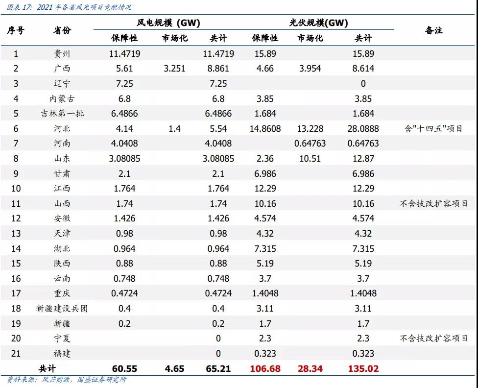 同時,2021年超200GW風光項目完成競配,光伏超過135GW。據(jù)光伏盒子不完全統(tǒng)計,2021年共有超過200GW的風光項目完成競爭性配置(不含大基地與一體化項目),其中光伏135.02GW。此外,疊加兩批大基地項目(第一批近百GW,已啟動75GW)的陸續(xù)啟動,未來兩光伏市場將依舊保持增長態(tài)勢。