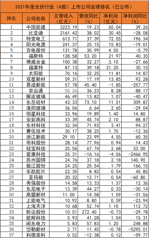 截至發(fā)稿,國內(nèi)光伏企業(yè)中,共有37家A股上市公司公布2021年年報。營收總體保持增長,部分企業(yè)營收爆發(fā)式增長。凈利潤方面表現(xiàn)不一,但上游硅料、鋁材持續(xù)性漲價明顯產(chǎn)生了一定影響,虧損多集中在中游金剛線、電池片、邊框生產(chǎn)制造企業(yè)。