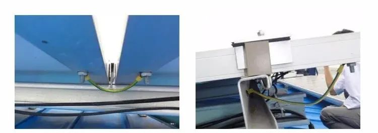 4、組件與支架等電位連接:組件鋁邊框與鍍鋅支架或鋁合金支架都做了鍍層處理,僅僅通過壓塊的壓接滿足不了接地要求,只有組件的接地孔連接到支架上才算組件有效接地。因此在這些位置必須建立外部防雷系統(tǒng)和金屬光伏組件之間的直接等電位連接,一般可以采用4mm²的黃綠雙色線。